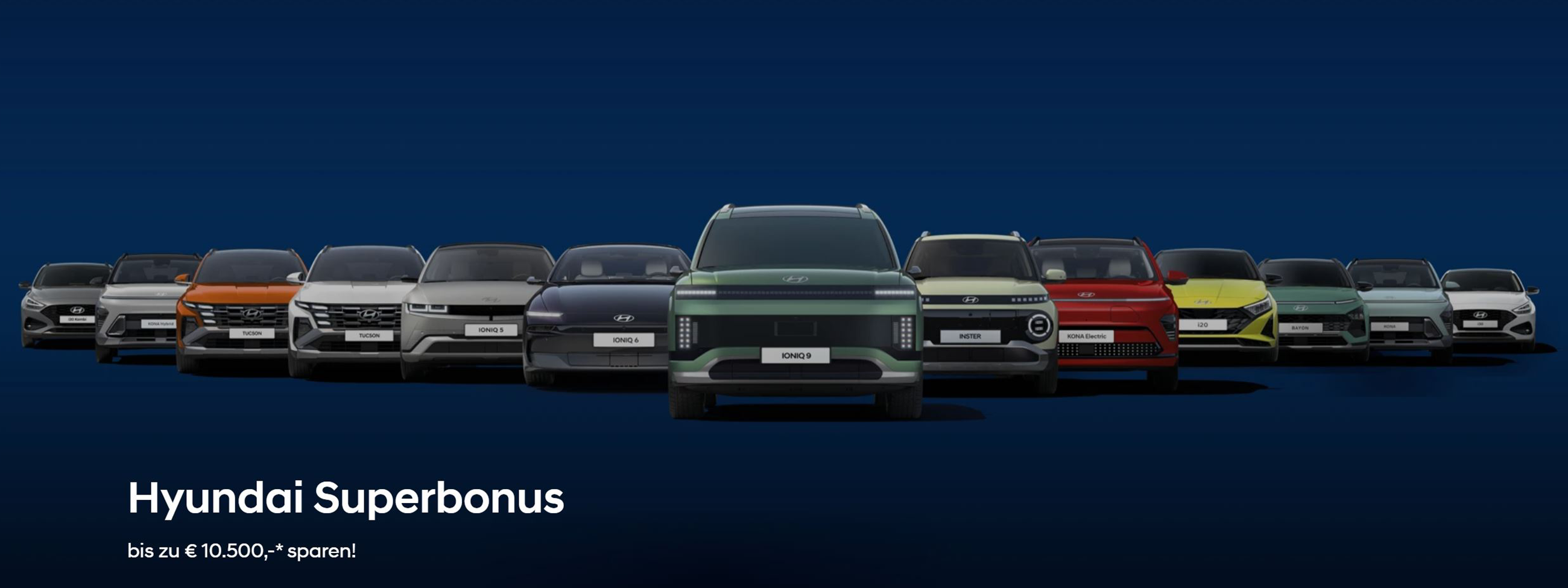 Hyundai macht den Einstieg in ein neues Fahrzeug aktuell besonders attraktiv: Mit dem neuen Hyundai Superbonus profitieren Sie je nach Modell von hohen Preisvorteilen, attraktiven Monatsraten und zusätzlichen Boni beim Fahrzeugkauf.